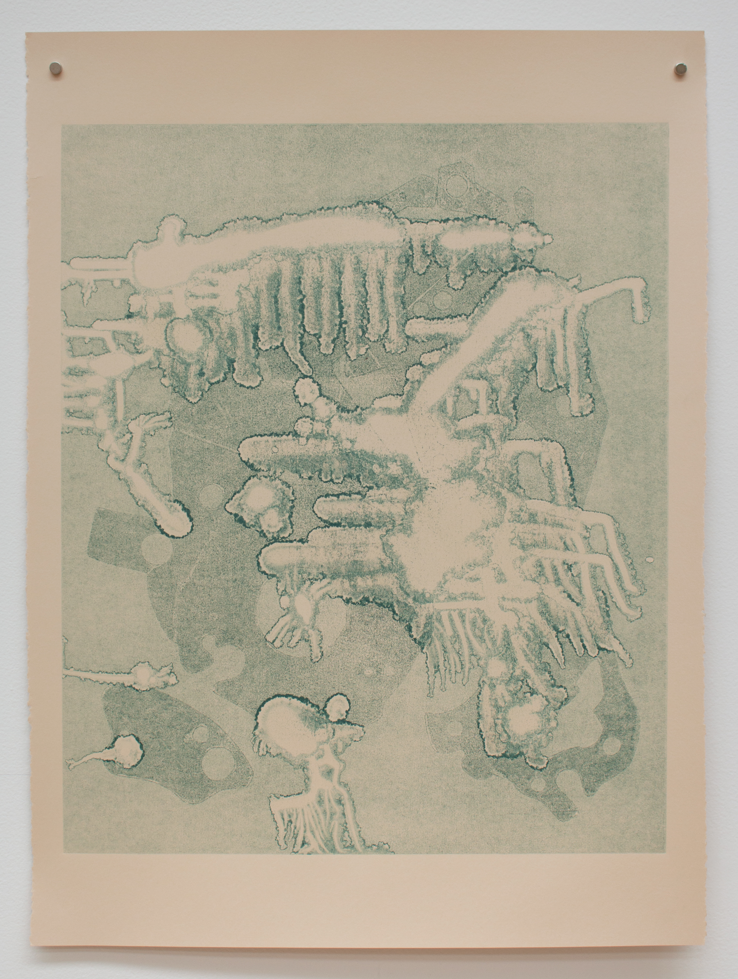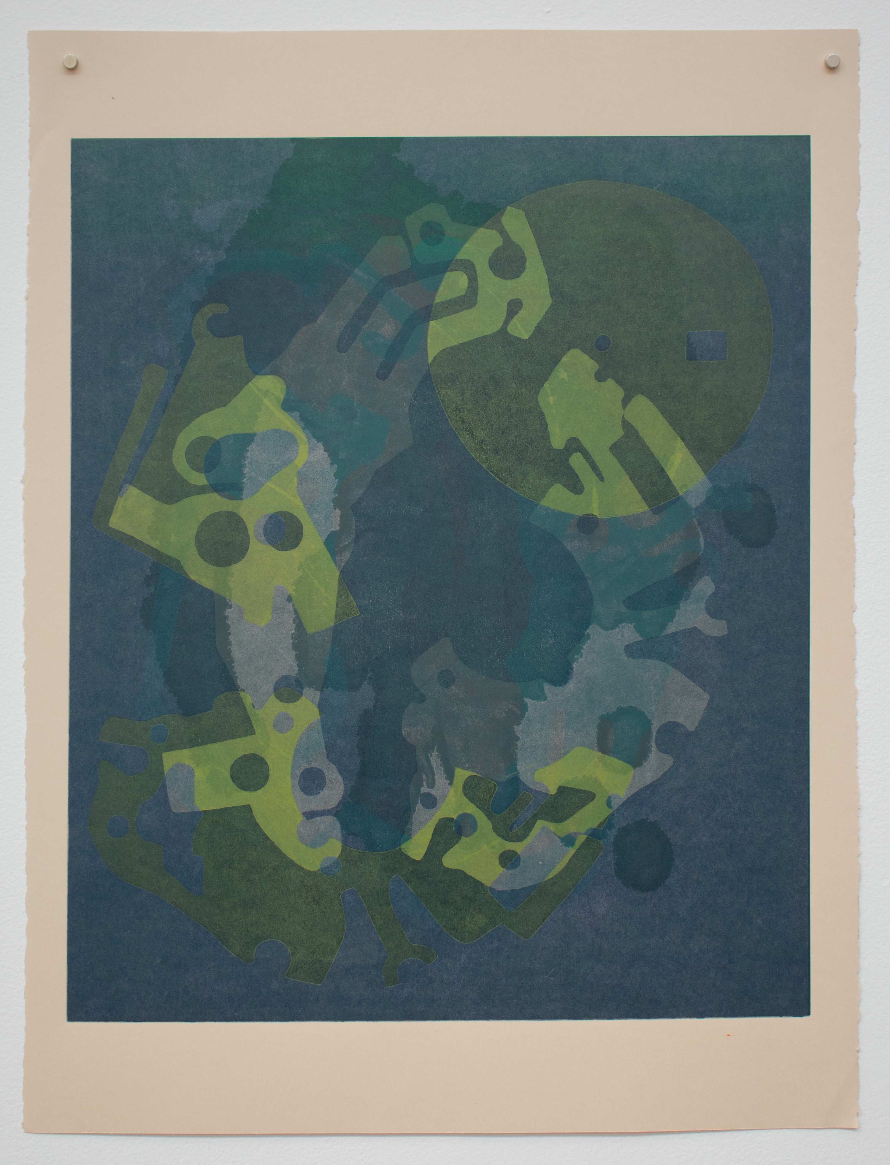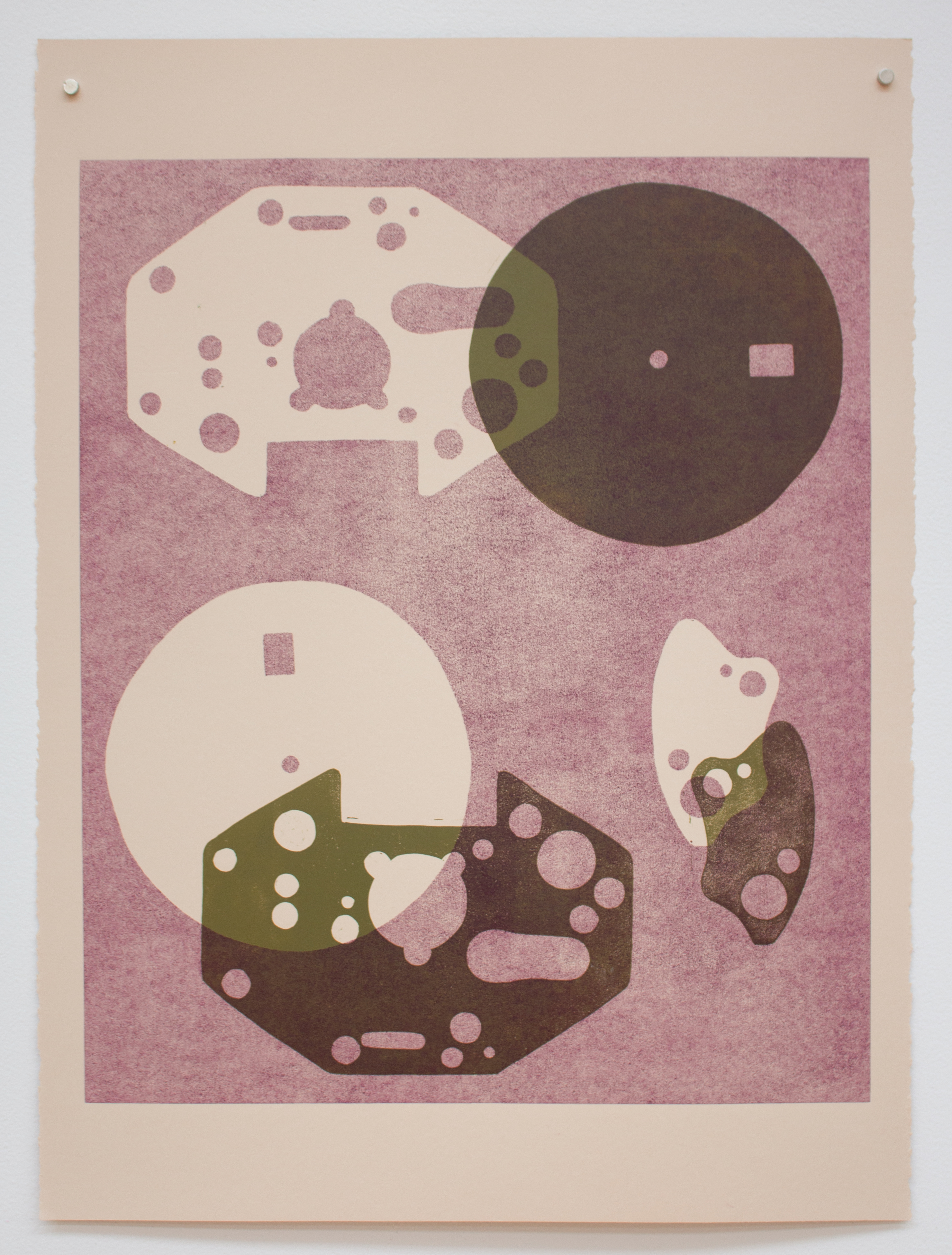 Combining linoleum prints with layers of dissolved ink creates depth and dimensionality, contributing to the intricacy of each print. Achieved by using mineral spirits on inked plexiglass, the veiled monoprints of diluted pigment merge chemical with mechanical, balancing motion and linearity. Though variability is integral to the process, standardized registration creates structure, keeping expanses of color organized. The use of the same shapes throughout the pieces additionally maintains cohesion and consistency.